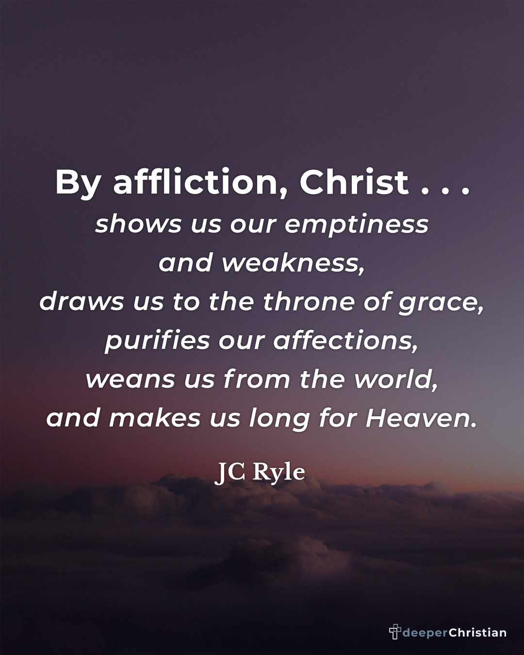 By affliction, Christ . . .shows us our emptiness and weakness,draws us to the throne of grace,purifies our affections,weans us from the world,and makes us long for Heaven.
